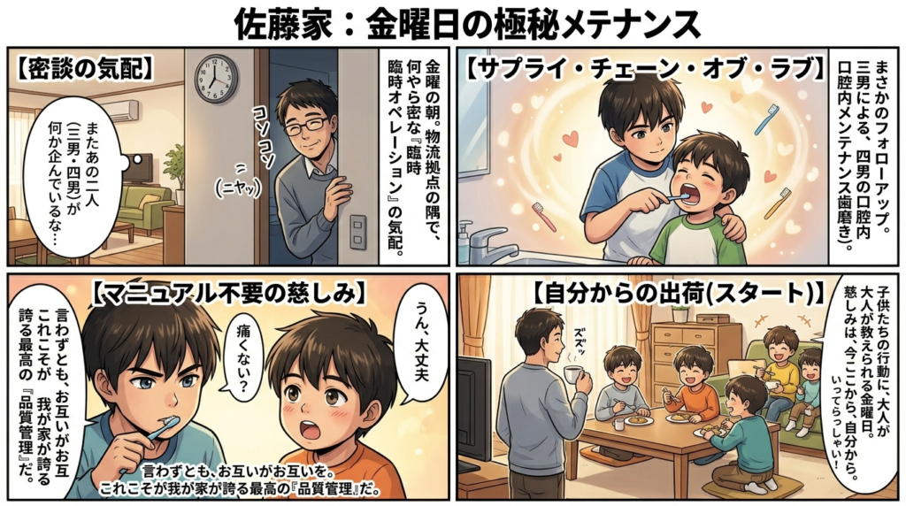 まさかの四男の歯磨きのフォローを三男が。